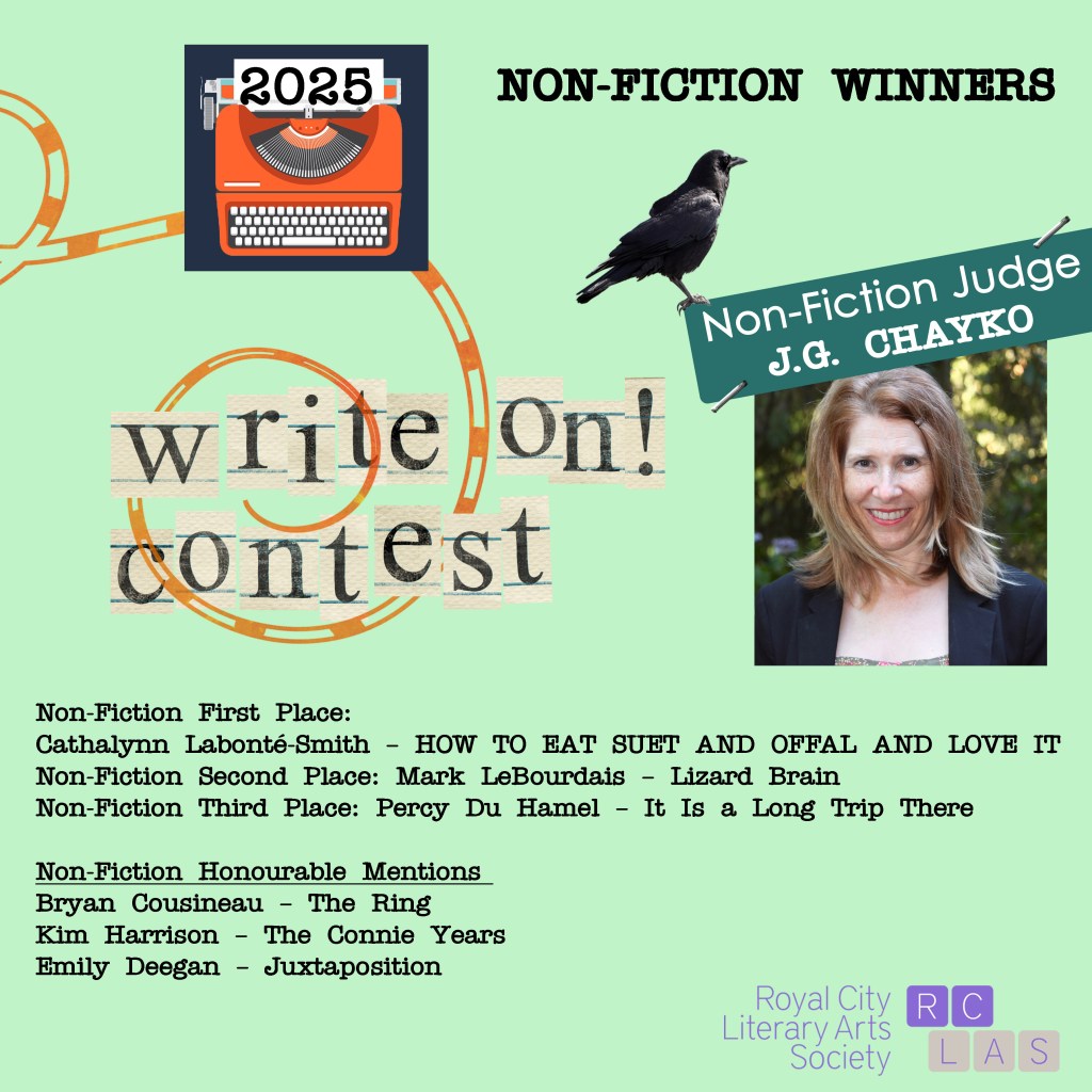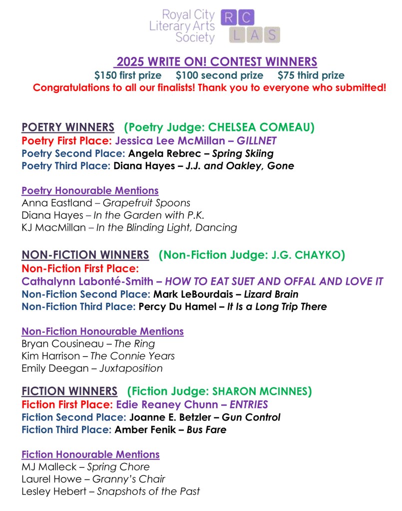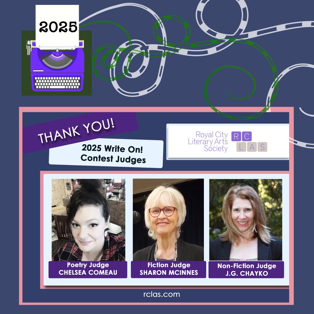 On behalf of the Royal City Literary Arts Society, I wish to thank each of our hardworking judges in this year’s Write on! Contest! With gratitude!