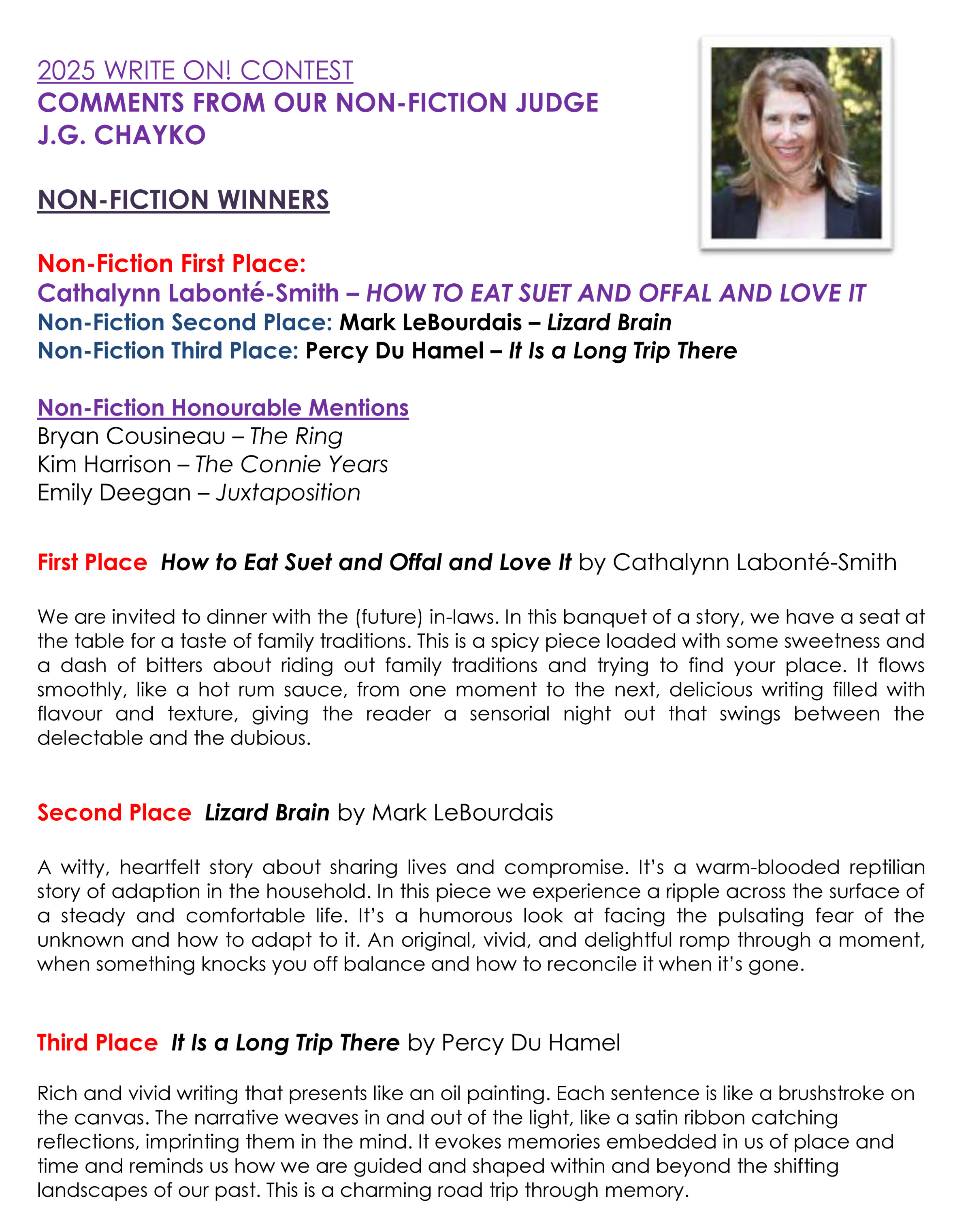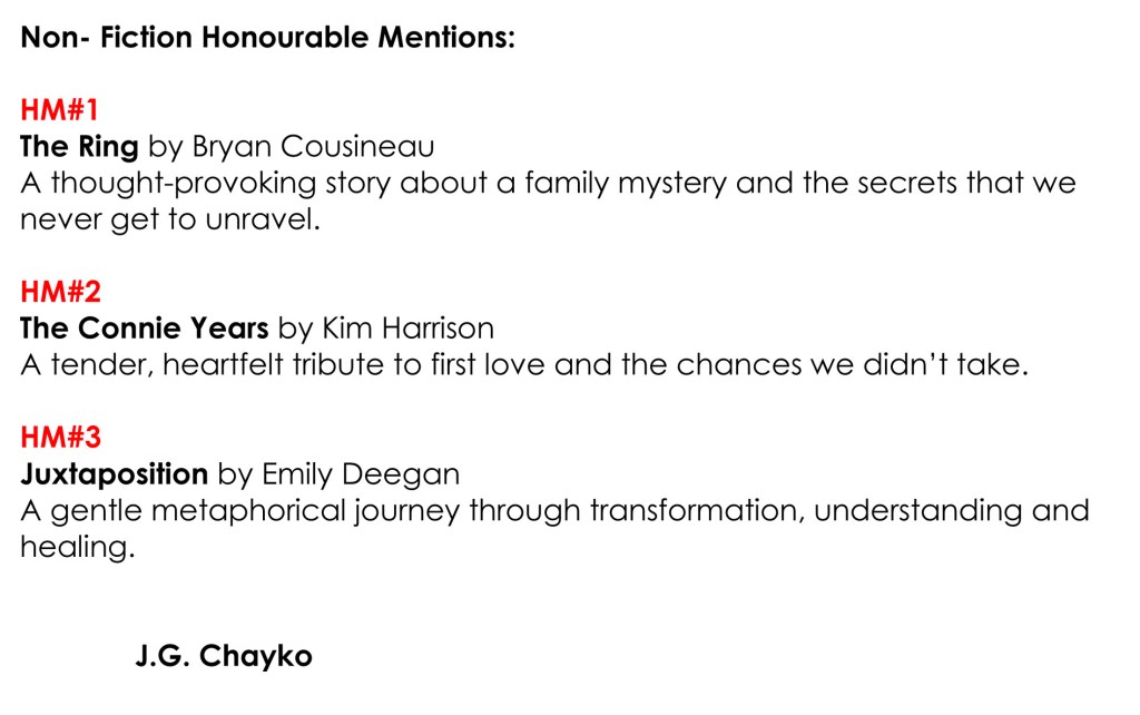 NON-FICTION WINNERS (Non-Fiction Judge: J.G. CHAYKO)